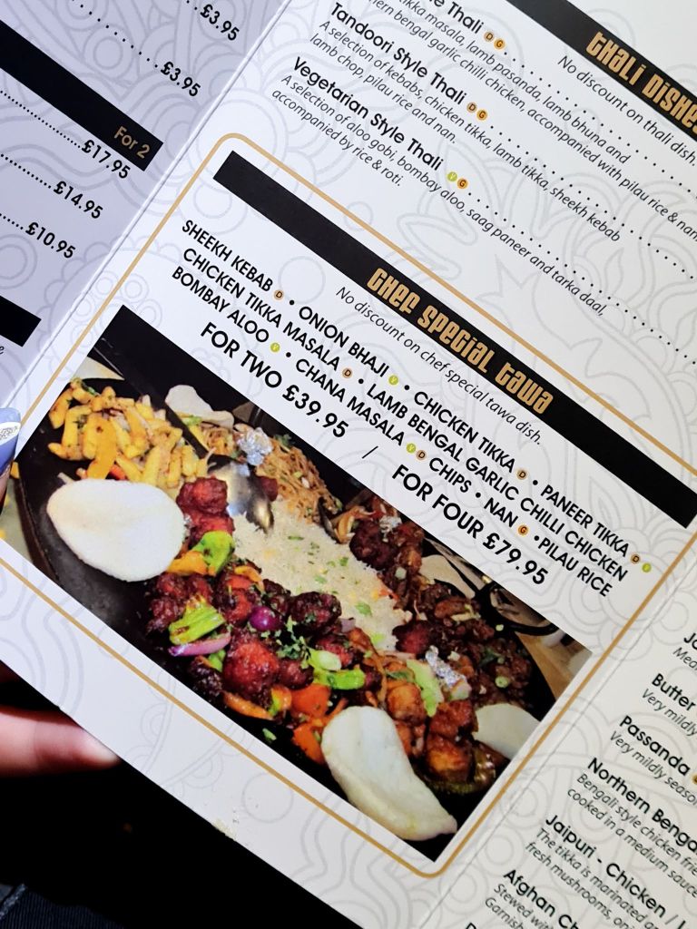 It was the Chef Special Tawa – Sheekh Kebab, Onion Bhaji, Chicken Tikka, Paneer Tikka, Chicken Tikka Masala, Lamb Bengal Garlic Chilli Chicken Bombay aloo, Chana Masala, Chips, Nan, Pilau Rice for two £39.95 for four people £79.95 It looked very impressive when it came out it defiantly caught the attention of other people dining, we even had a couple come over and ask if they could have a look.
